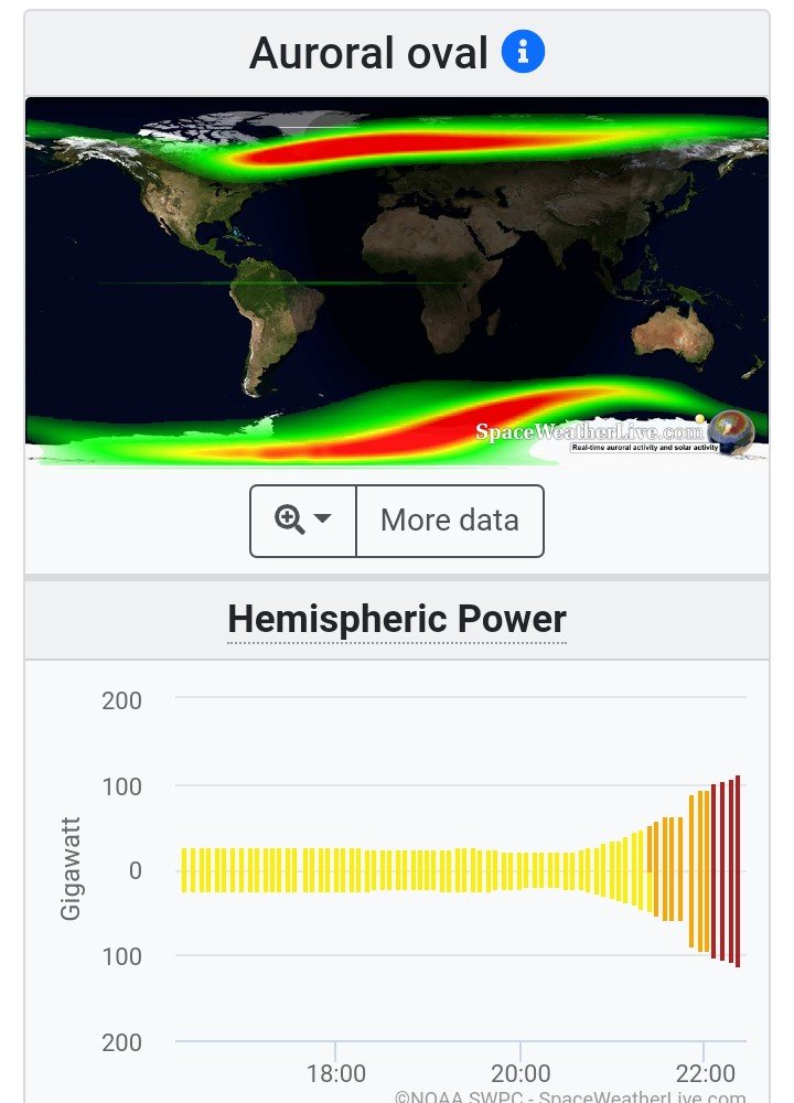 Tormenta Geomágnetica con llegada de masa coronal a la Tierra, impacto posible a 65 grados de latitud geomágnetica, en los polos, la Tormenta Geomágnetica está catalogada en G1 dónde el índice Kp en 5.