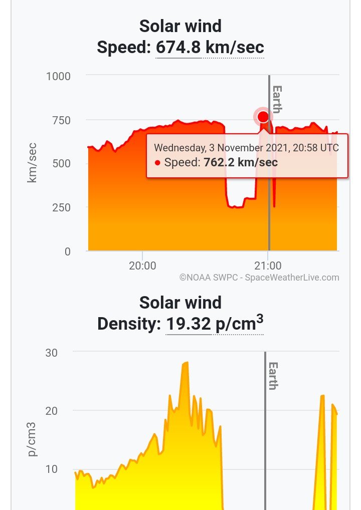 El viento solar está 674,8 Km por segundo, hacia la tierra.