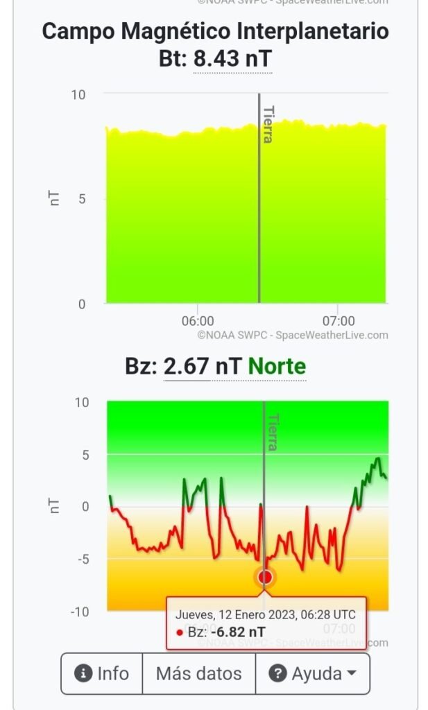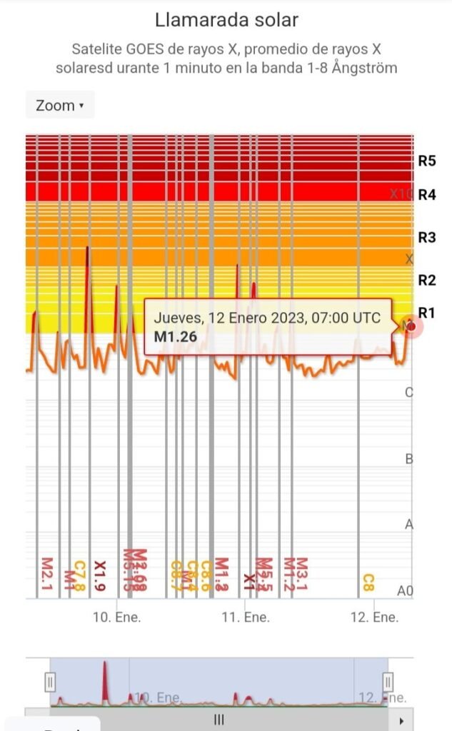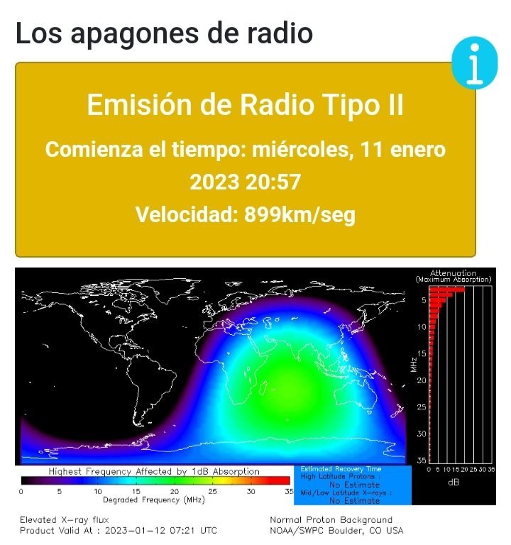 Hora de emisión: 11 de enero de 2023 21:29 Hs. UTC Las descripciones de la escala de clima espacial de la NOAA se pueden encontrar en Radio HF: Apagón de área amplia de la comunicación por radio HF, pérdida de contacto por radio durante aproximadamente una hora en el lado iluminado por el sol de la Tierra, el índice KP en 2.