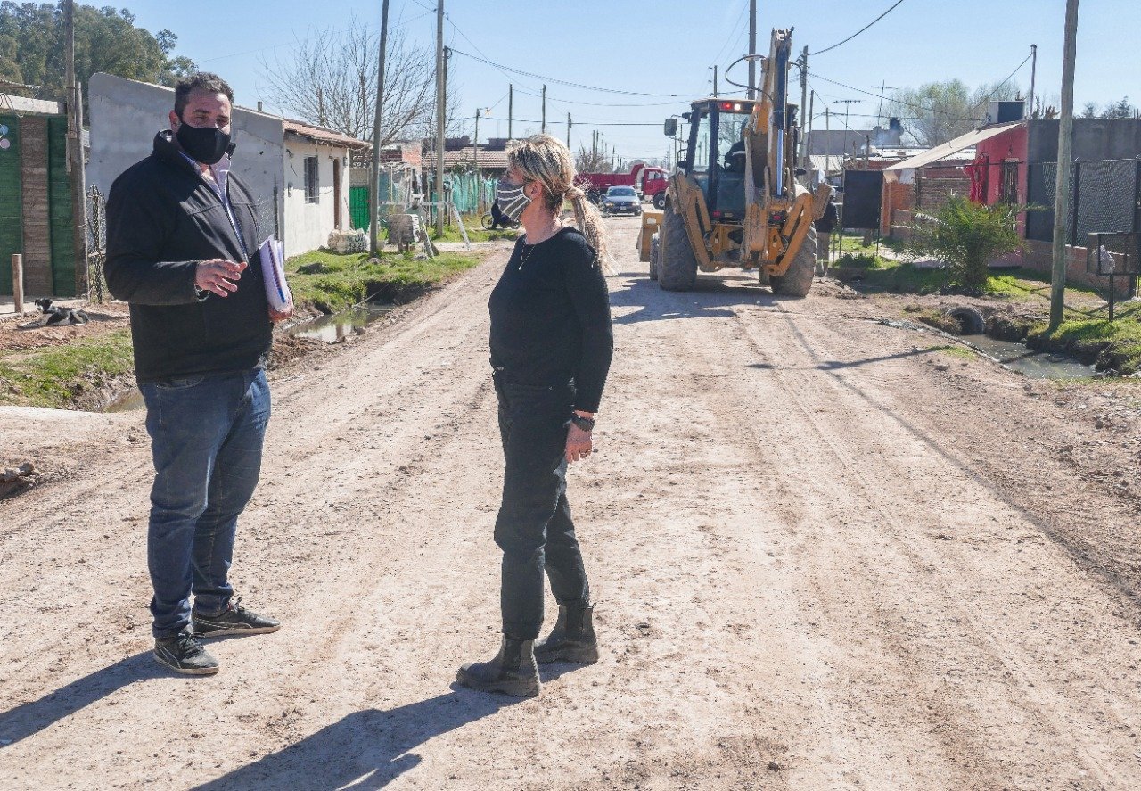 La jefa comunal observó el trabajo de mejoras en calles y escurrimiento de efluentes, que incluyeron tareas de abovedado, limpieza de zanjeos y colocación de nuevos caños en diferentes puntos del distrito.