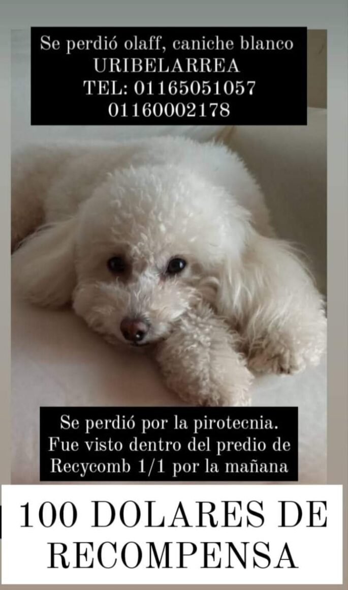 Se lo vio por última vez en el acceso a Uribelarrea en el Km 82 en la Ruta Nacional Número 205, las 18 hs frente a la empresa recycomb no tenía collar su nombre es Olaf caniche blanco.