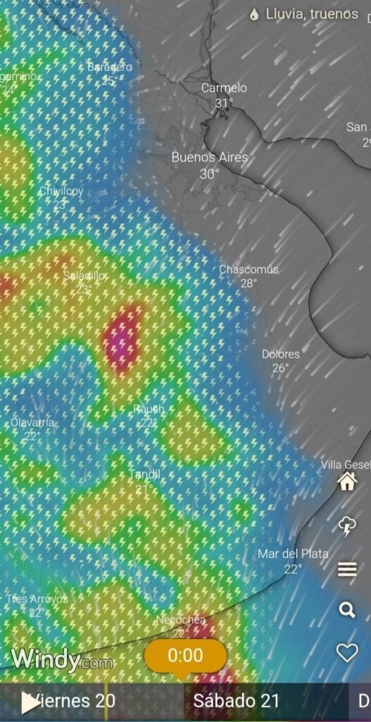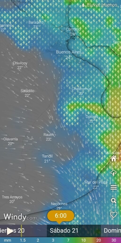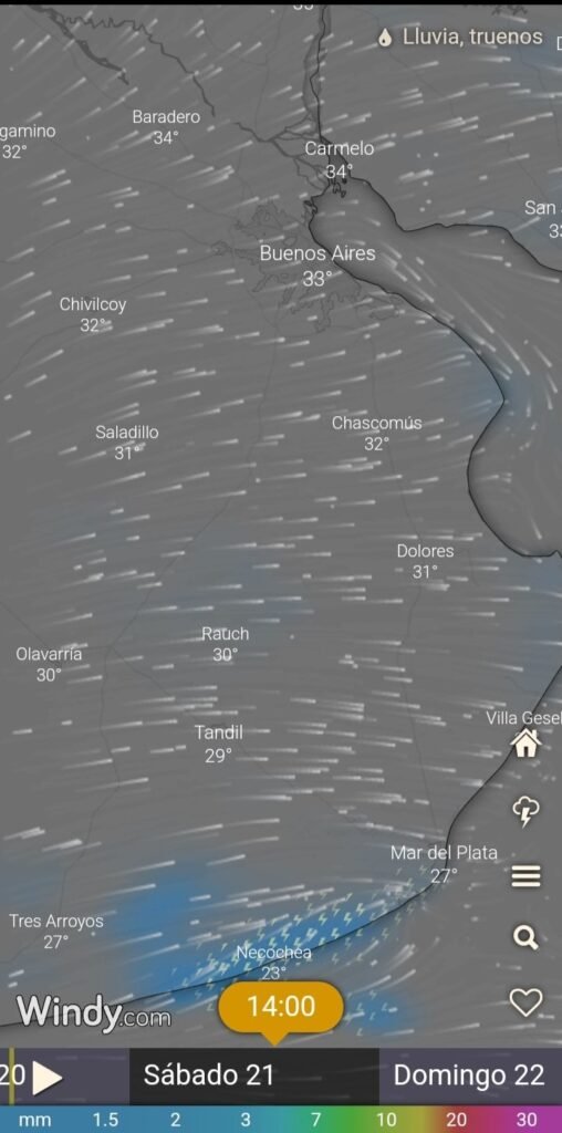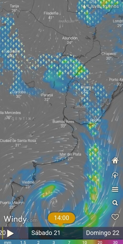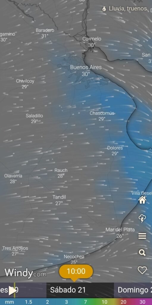 A las 10:00 del 21/01/2023 las condiciones climáticas mejorarán, y para el medio día, el mal tiempo se dirigirá al Norte del País Entré Ríos Corrientes, el mal clima estará en el océano Atlántico dentro de las 200 millas continental, zona Bueno Aires, en la zona sur de la Provincia de Buenos Aires, se formará un centro de baja presión que arremolina la tormenta en la zona del Atlántico al Sur de la costa Bonaerense.