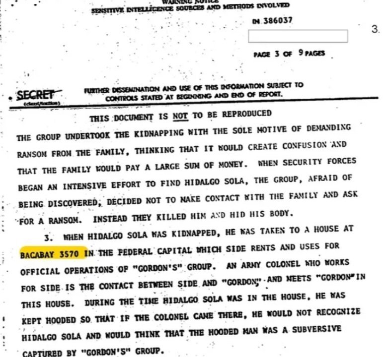 Ese documento menciona que el diplomático argentino Héctor Hidalgo Solá, secuestrado por la dictadura, había estado detenido en la casa de esa dirección, a la que mencionaban como una de las bases de la banda de los Gordon.