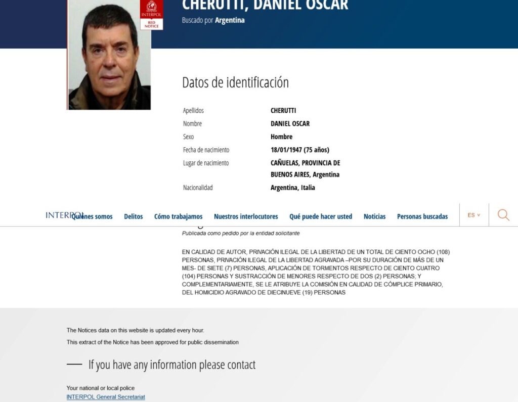El pedido de detención del Juzgado de Rafecas ordeno la detención internacional en Diciembre del 2022 para el Ex oficial de la Policía Federal, Daniel Oscar Cherutti, con la alerta Roja en Interpol, la investigación empieza por Un documento desclasificado de la CIA, socia de la SIDE en el Proceso Militar sobre un expediente de la justicia militar de hace 40 años, con los mails de un espía de la SIDE.