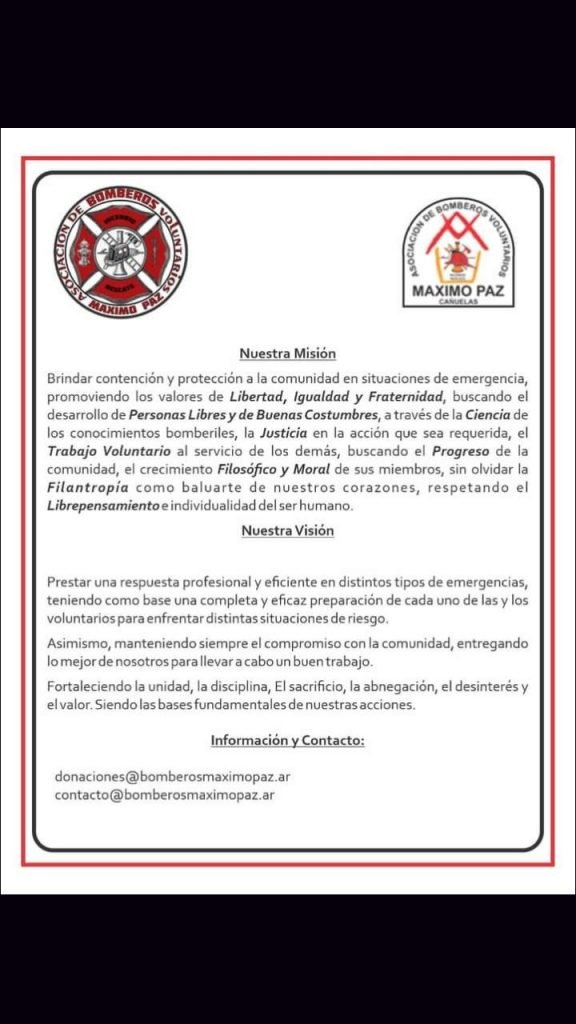 Cañuelas Noticias seguirá el crecimiento de la Asociación de los Bomberos Voluntarios de Máximo Paz, que empieza hace más de 4 meses y tienen en sus filas más de 120 personas que se están capacitando para la Comunidad de Máximo Paz en el Partido de Cañuelas, con un número de Profesionales que están todos juntos y listos para el servicio a partir del 4 de junio del 2022, ya están con las guardias día tras día, en un sueño que se hizo realidad el 24 de septiembre del 2022, con su Bandera, escudo y son una realidad que está creciendo día a día en la comunidad del partido de Cañuelas en la localidad de Máximo Paz.