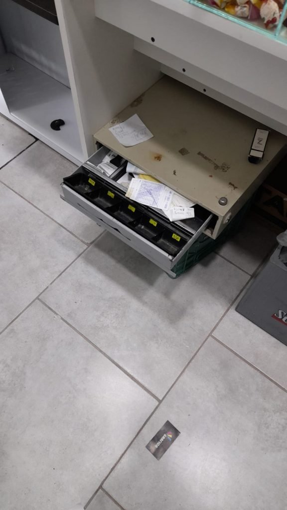 Ante la sorpresa empezaron a ver lo que les robaron, cigarros en gran cantidad, dinero, mercadería, un celular, el delincuente realizo un Boquete en la parte trasera del súper, a pocos metros de un agujero en el alambre perimetral, el rastrero, no se dio cuenta en que fue filmado en todo lo que realizó dentro del Comercio, que abrió sus puertas hace 15 días.