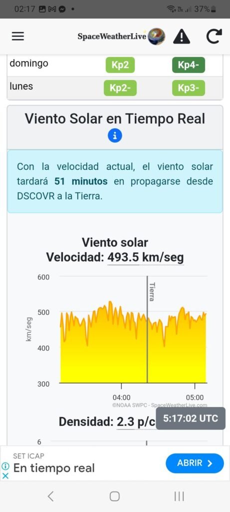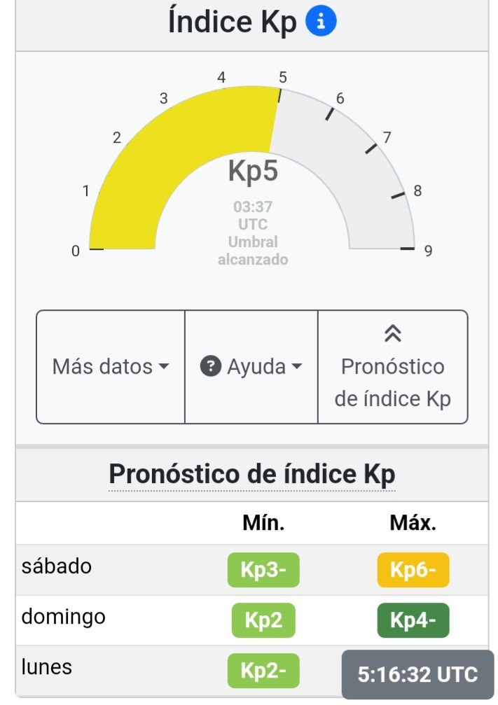 Índice K Geomagnético. 5 (umbral alcanzado a las 03:35 UTC).
