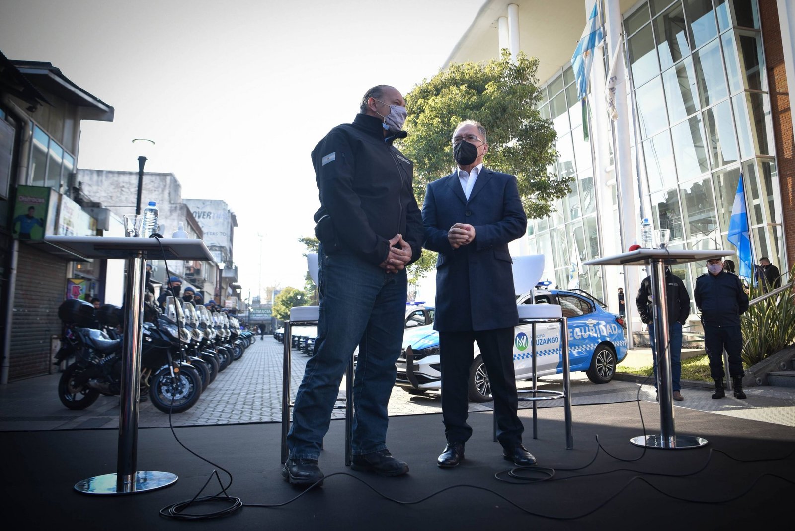 El Ministro de Seguridad de la Provincia de Buenos Aires, Sergio Berni, junto al Intendente de Ituzaingó, Alberto Descalzo, participaron del acto de presentación de 20 motos y 10 nuevos patrulleros que se suman a los 30 ya entregados al municipio y que se encuentra enmarcado dentro del Plan Integral de Seguridad Provincial. El mismo se llevó a cabo en la peatonal Eva Perón, Ituzaingó. Provincia de Buenos Aires.