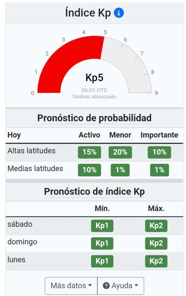 Tormenta geomagnética G1 índice Kp en 5 se espera fluctuaciones en la red eléctrica.