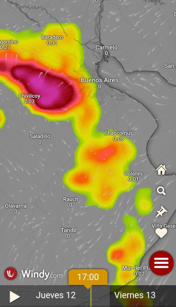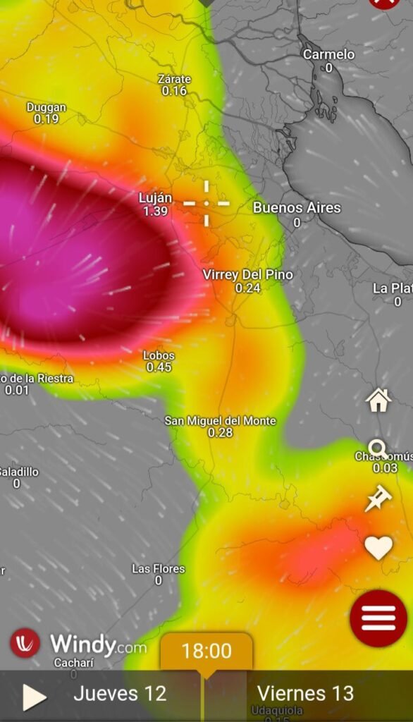 Un frente de tormentas que ya ha pasado por Bragado y está entrando en Cañuelas. Este frente trae consigo lluvias intensas, granizo y posibles ráfagas de viento. Es bueno que estés prestando atención a las advertencias meteorológicas.